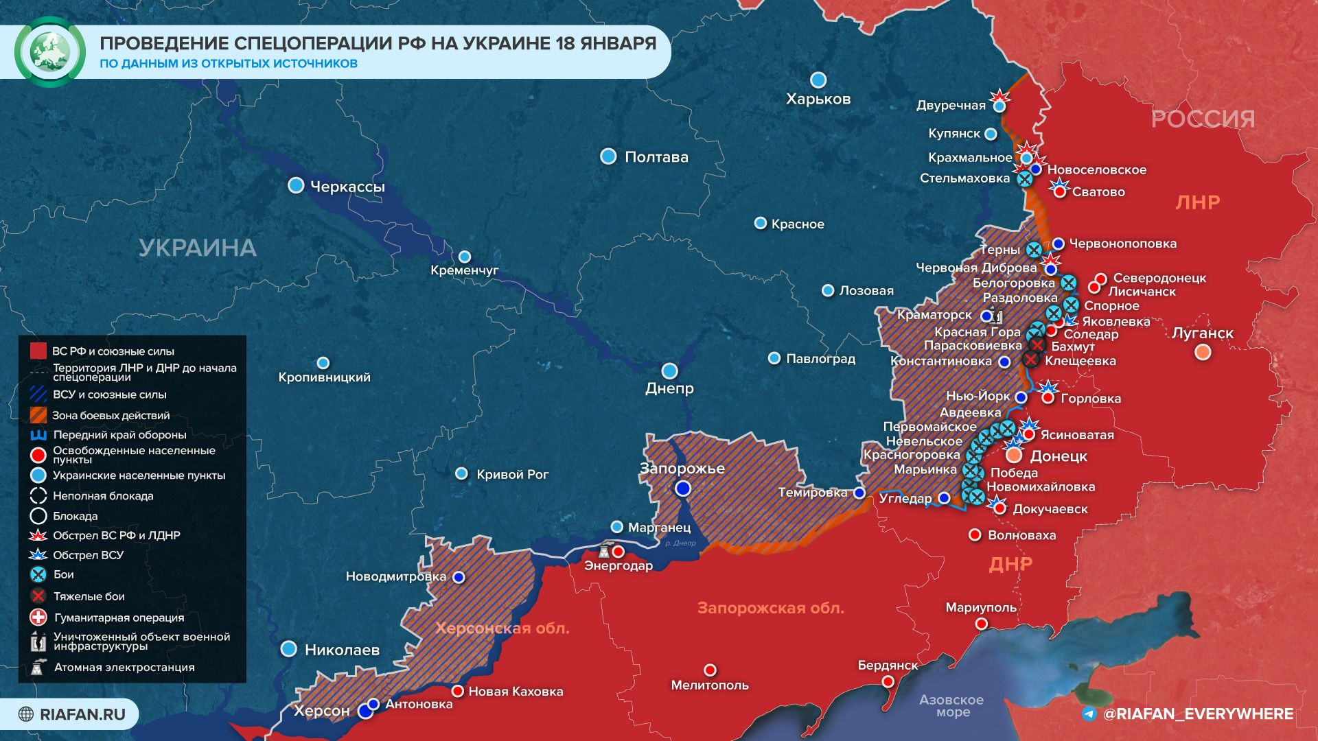 Обновленная новая карта боевых действий на Украине по данным на утро 19 января — Минобороны обновило новую карту боевых действий 19.01.2023