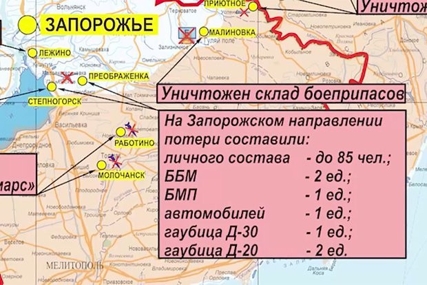 На Ореховском участке бои приняли позиционный характер. ВС РФ закрепляются на ранее занятых позициях и ведут контрбатарейную борьбу. Противник перебрасывает на участок подкрепления.