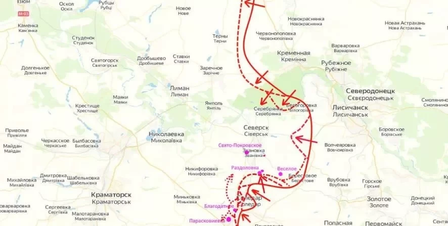 Артемовск. Без занятия западного берега реки, говорить об охвате противника с севера не имеет смысла. Да и штурм Парасковиевки (также расположенной на левом берегу) был очень сильно затруднен. Плацдарм опирающийся на Благодатное позволяет обойти этот н.п. с севера и думаю, уже очень скоро мы услышим о боях на его северных околицах. А уже потом будет возможным оперативное и просто окружение Артемовска (Бахмута). Если противник не сбежит из города раньше, передает "Глас Народа".