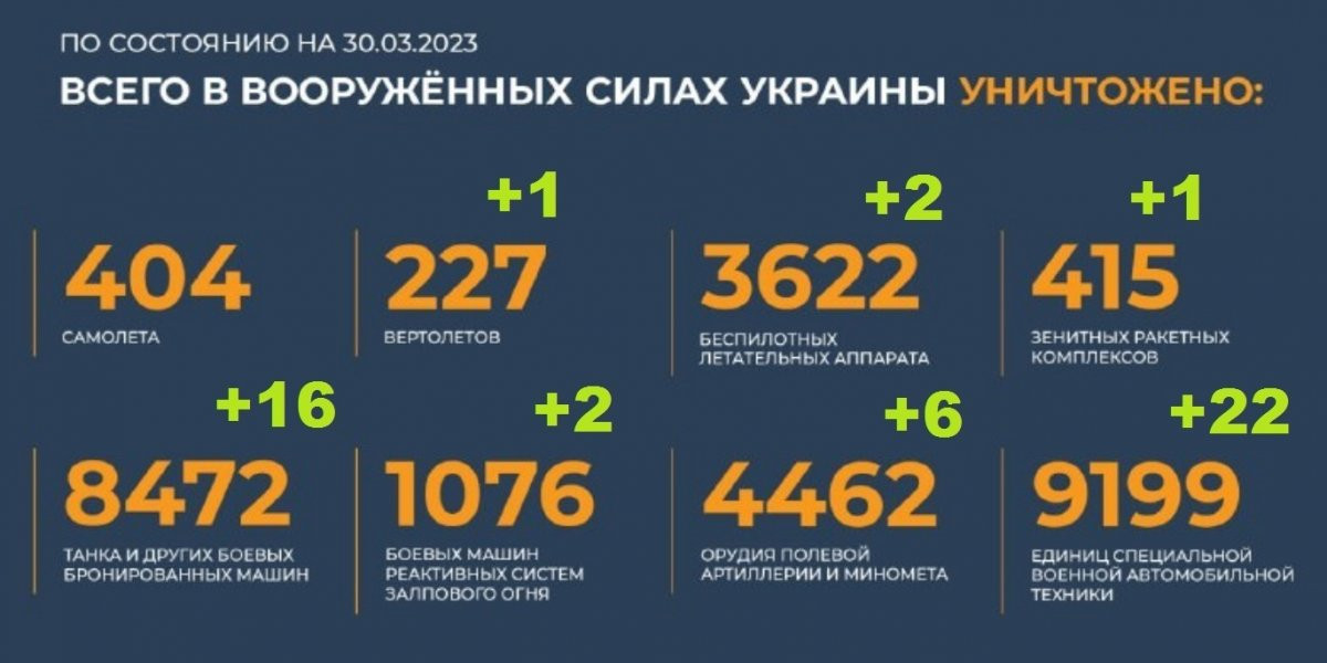 - Всего с начала проведения специальной военной операции уничтожены: 404 самолета, 227 вертолетов, 3622 беспилотных летательных аппарата, 415 зенитных ракетных комплексов, 8472 танка и других боевых бронированных машин, 1076 боевых машин реактивных систем залпового огня, 4462 орудия полевой артиллерии и миномета, а также 9199 единиц специальной военной автомобильной техники.