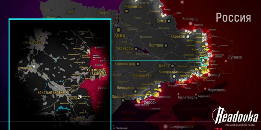 В Артемовске бойцы ЧВК «Вагнер» продвинулись вдоль улицы Независимости и улицы Мира, а также от центрального рынка на север. В южных кварталах они дошли до улицы Василия Першина. «Оркестранты» продолжают наступать в районе Красного и Хромово.