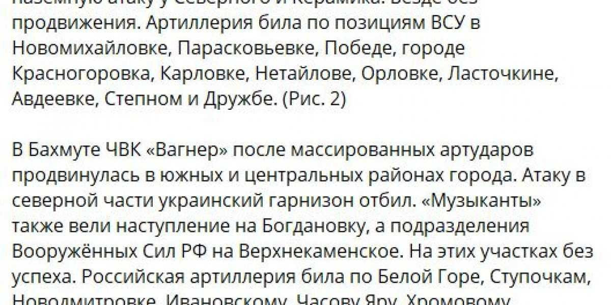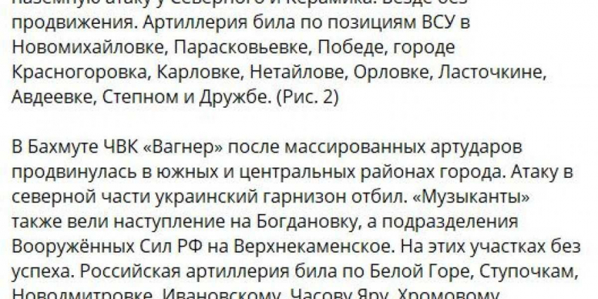 «В Бахмуте штурмовые группы ЧВК «Вагнер» продолжают теснить противника в северных кварталах. Российские силы практически полностью контролируют район Интернат и ведут бои у развилки железнодорожных путей. В центре города «вагнеровцы» продвинулись в направлении Салтовского мясокомбината и Бахмутской автостанции.