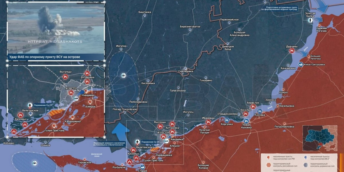 На Голопристанском участке расчёт ПЗРК ВС РФ сбил украинский штурмовик Су-25 над Велетенским, а самолёты ВКС России нанесли удар ФАБами по району высадки десанта ССО Украины южнее Кизомыса.