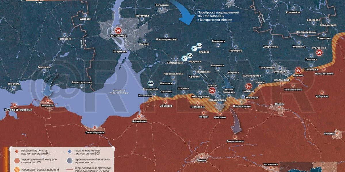 - На текущий момент на рубеже Славное — Одаровка идет оборудование позиционных районов гаубично-самоходного и реактивного дивизионов 118 омбр ВСУ. При этом 1, 2 и 3 батальоны готовятся к штурму на направлении Работино — Очеретоватое с последующим выходом к Мелитополю.