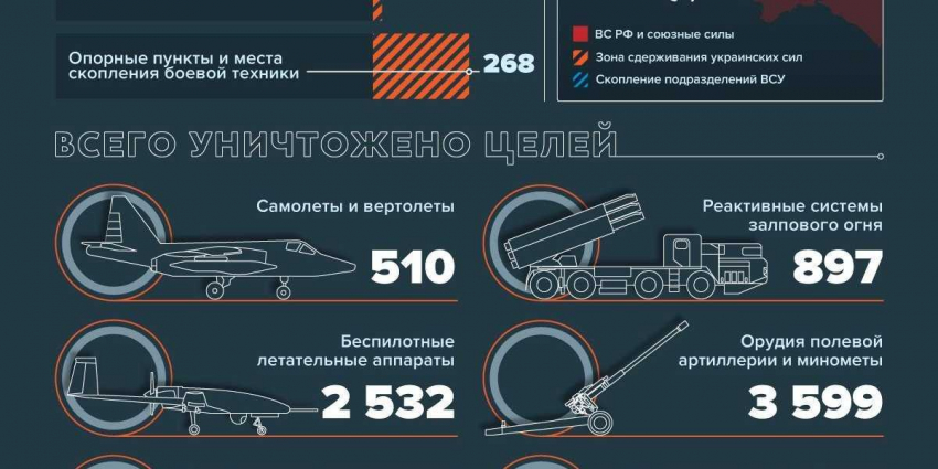 Тем временем авиация и артиллерия поразили девять командных пунктов противника, радиолокационную станцию контрбатарейной борьбы AN/TPQ-50, 86 артиллерийских подразделений и 176 мест сосредоточения живой силы и техники ВСУ. Также средствами противовоздушной обороны перехвачены десять беспилотников.