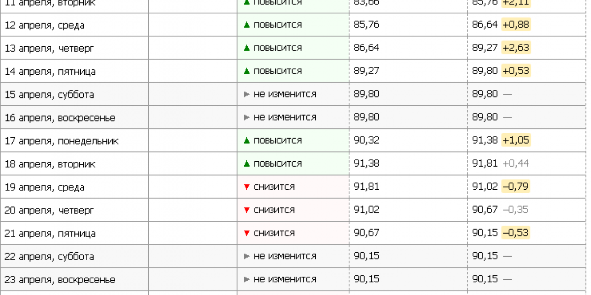 Американская валюта стабилизировалась после апрельского взлёта курса с 75 рублей в марте до 82 (8 апреля) за доллар. Сегодня, по данным Мосбиржи, доллар стоит 80,3 рубля, евро — 88,5.