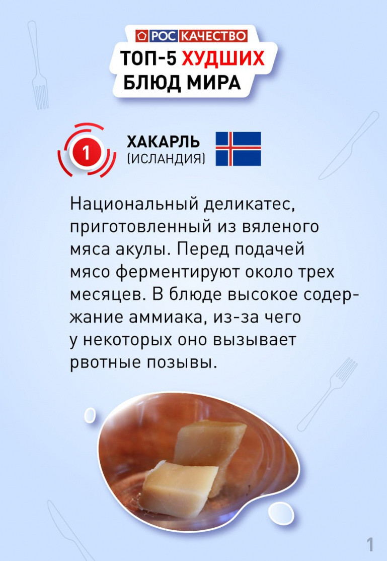 Возглавил антирейтинг хакарль (он же хаукартль). Жутковатый исландский деликатес готовят из частично разложившегося мяса акулы, которое затем вялят.