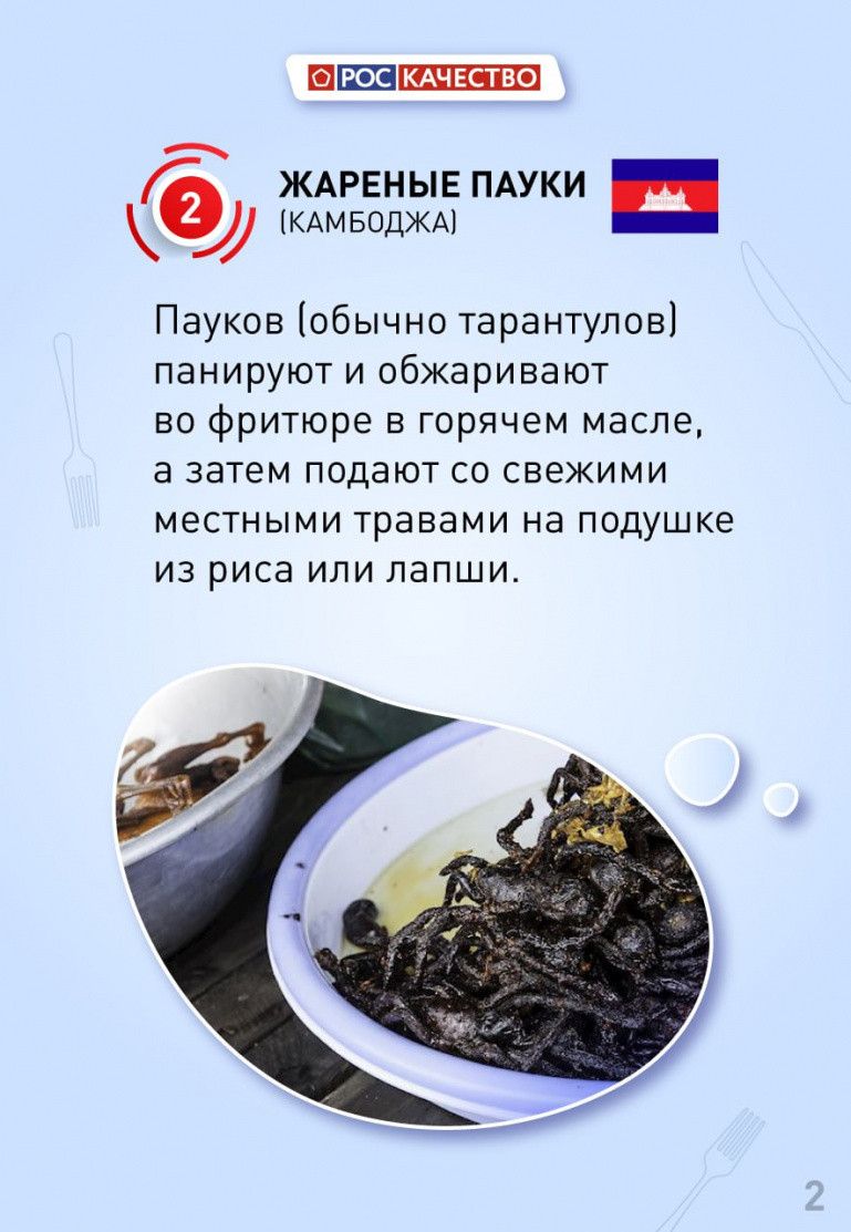 На второй строчке оказались жареные пауки. Тарантулами во фритюре лакомятся в Камбодже.