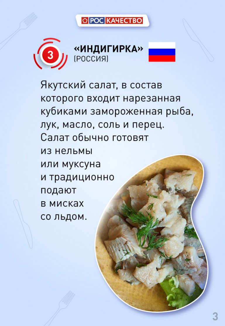 Салат «Индигирка» оказался на третьем месте рейтинга самых невкусных блюд. Это визитная карточка якутской кухни. Салат готовится из нарезанной кубиками замороженной рыбы, которую смешивают с луком, маслом, солью и перцем. В путеводителе TasteAtlas говорится, что «секрет ужасного рейтинга этого блюда — в замороженных рыбных кубиках».