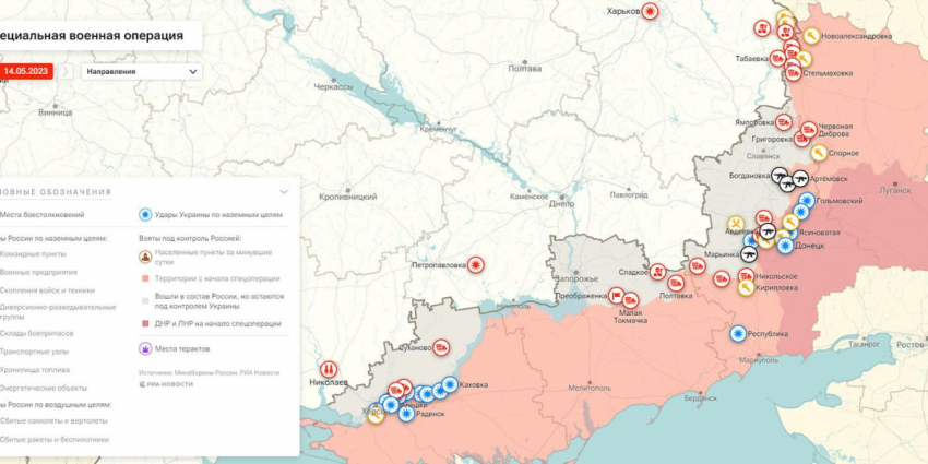 Фронтовая хроника, сводка боевых действий артёмовском и других направлениях фронтов СВО к утру 15 мая 2023 г.: