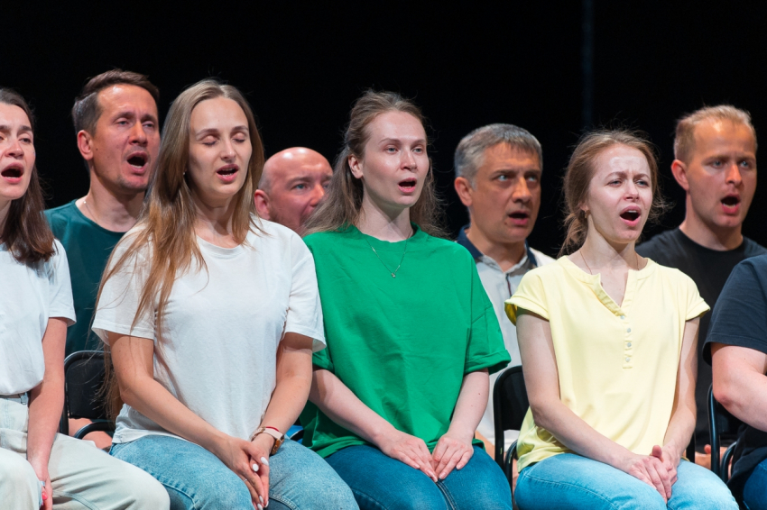 Но вот звук выровнен, артисты настроены друг на друга, и задача усложняется. Теперь необходимо настроить общий фон. Упражнение, очень важное, особенно в драматическом театре. Поскольку в драматическом театре на самом деле главное не демонстрация каких-то выдающихся вокальных качеств отдельного артиста, а умение артистов слушать друг друга, поясняет Иван Иванович.