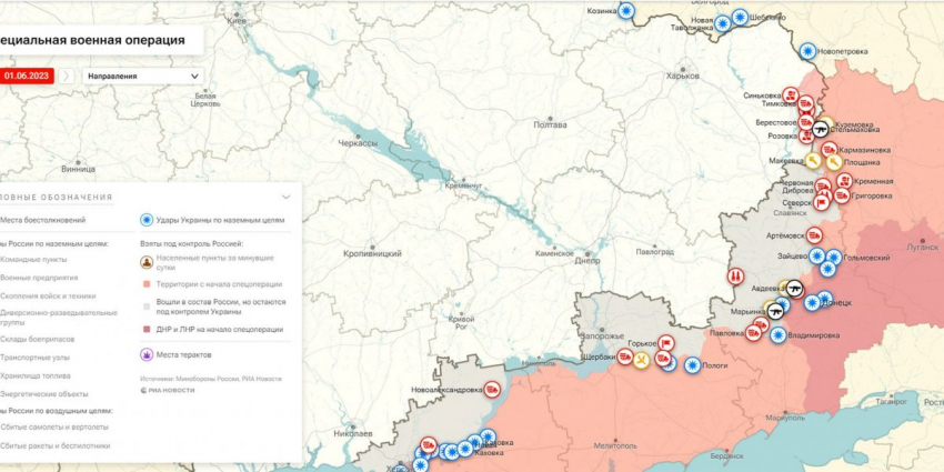- Карта боевых действий на Украине, к утру 2 июня 2023г., от РИА Новости. Карта специальной военной операции.