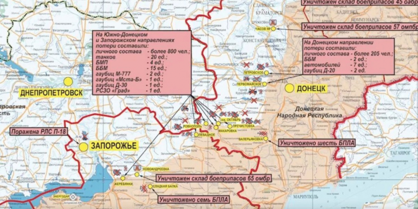 Общие потери противника за сутки в данных районах составили до 275-ти украинских военнослужащих, четыре танка, пятнадцать боевых бронированных машин, восемь автомобилей, а также гаубица «Мста-Б».