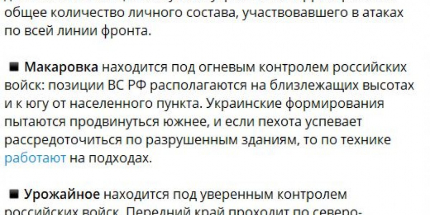 Министерство обороны России заявило в ходе брифинга об отражении атак ВСУ в районах Макаровки и Пречистовки, а также уничтожении техники противника в районе Ровнополя. Кроме того, сорваны попытки наступления украинской армии у Петровского и Первомайского. В районах Северска Малого и Часова Яра уничтожены склады боеприпасов ВСУ. У Григоровки ликвидирована украинская диверсионно-разведывательная группа (ДРГ).