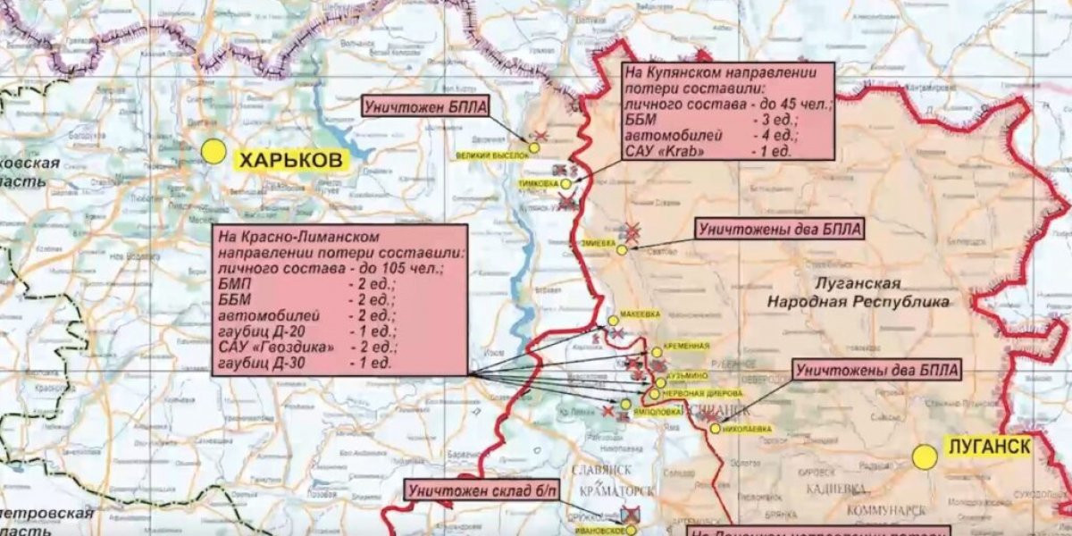 Всего на Купянском и Лиманском направлениях убиты или ранены до 150 солдат, поражены 2 БМП, 5 броневиков, 6 автомобилей, самоходки Krab и 2 «Гвоздики», гаубицы Д-20 и Д-30.