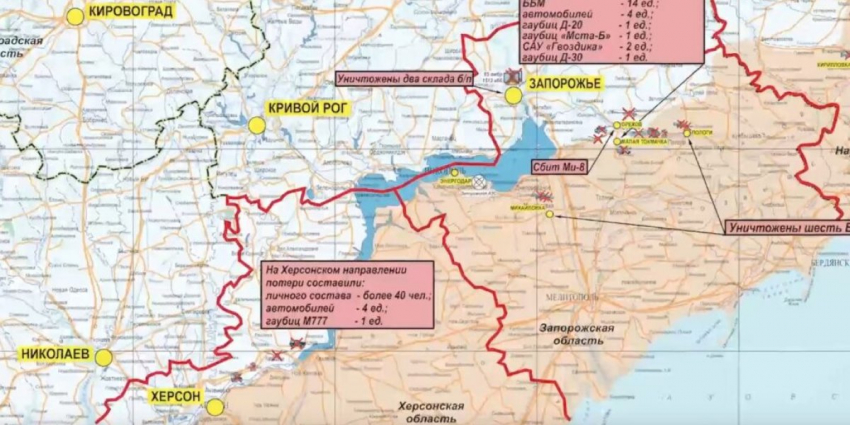В районе города Запорожье поражены два артиллерийских склада 1513-й базы боеприпасов и 65-й бригады. Вместе с этим над Ореховым сбит вертолет Ми-8 ВСУ.
