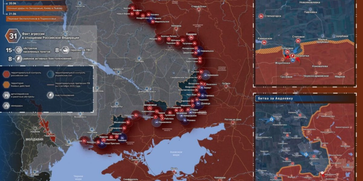 - Карта боевых действий на Украине сегодня, обстановка 22 июня 2023 года от Mash. Бои за Авдеевку