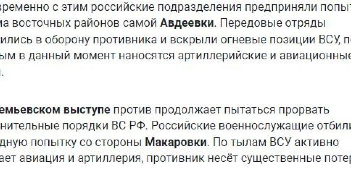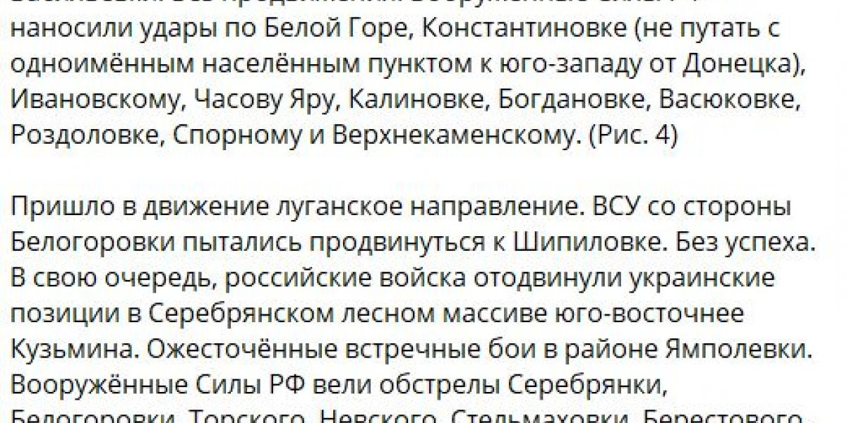 ВСУ на Угледарском участке атаковали в районах Ровнополя, Старомайорского и Урожайного, продвинуться не сумели. На Донецком фронте российские войска вели наступление у Новомихайловки и на юго-западных подступах к Авдеевке. Кроме того, военкор Семен Пегов сообщает о контратаке ВС РФ у Орехово-Василевки на Артемовском направлении.