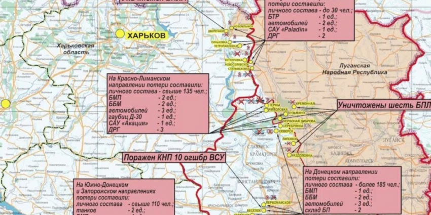 На Купянском направлении ударами армейской авиации, огнем артиллерии и активными действиями подразделений «Западной» группировки войск в течение суток уничтожено до 30-ти украинских военнослужащих, две боевые бронированные машины, три автомобиля, а также самоходная артиллерийская установка «Krab» польского производства. Кроме того, в районе населенного пункта Тимковка Харьковской области пресечена деятельность двух украинских диверсионно-разведывательных групп.