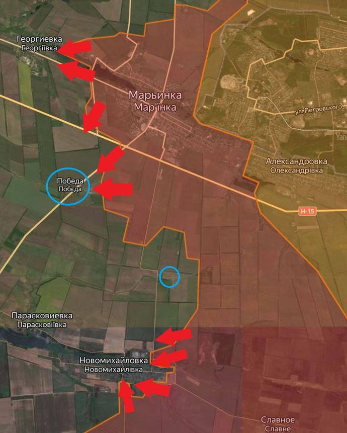 На юге Авдеевки российские войска при поддержке артиллерии вышли к улице Воробьёва. Это западнее ранее занятого плацдарма. А с северо-запада серьёзно продвинулись к центру города. Также они сумели выйти на окраины Ласточкина. Под ударами ВСУ в Екатериновке, Победе, городе Красногоровка, Семёновке и Бердычах. Российские позиции - в Марьинке и Донецке, пишет Telegram-канал Wargonzo.