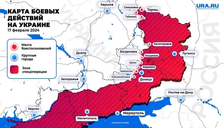 Обновлённая карта боевых действий на Украине по данным на 12:00 мск сегодня, 17.02.2024