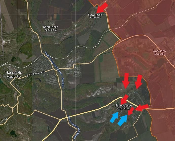 На Артёмовском направлении Вооружённые силы Российской Федерации (ВС РФ) продолжают штурм Богдановки. Наши бойцы продвинулись на северо-восточной окраине населённого пункта Красное с шириной участка в 1 км на глубину до 450 метров.