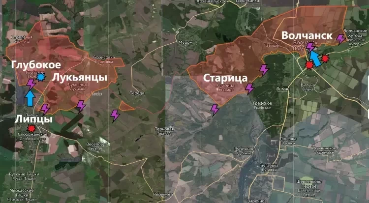 На Харьковском направлении ВСУ атакуют позиции ВС РФ южнее Глубокого. Штурмовые отряды противника идут вперёд при поддержке авиации, артиллерии и БПЛА, однако успеха добиться не могут. В Волчанске продолжаются ожесточенные бои. Противник атакует позиции ВС РФ в многоэтажной застройке севернее реки Волчья. Наши бойцы теснят противника к Волчанскому агрегатному заводу. Сообщается, что часть промзоны завода уже находится под контролем ВС РФ. Территория чуть восточнее завода находится за противником.