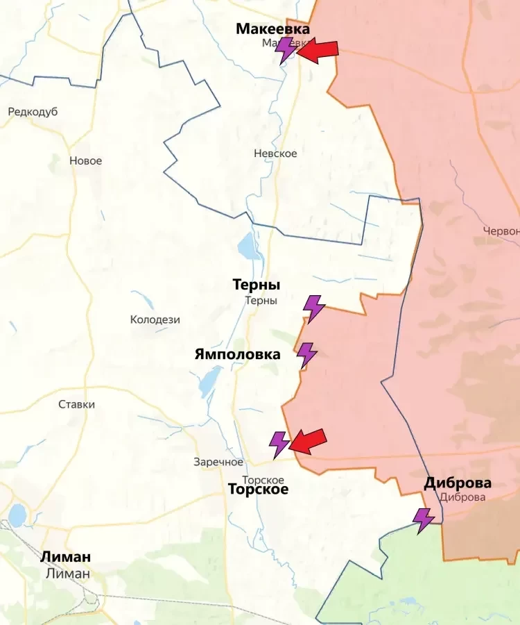 На Лиманском направлении подразделения ВС РФ штурмуют Макеевку. Ряд источников сообщает, что уже большая часть села - за нашими бойцами. Враг ещё остаётся на западных и южных окраинах населённого пункта. Через Макеевку проходит река Жеребец, которая южнее расширяется и представляет собой естественную водную преграду. На текущий момент неизвестно, куда двинутся ВС РФ после взятия Макеевки - на северо-запад или на юг, в сторону Терн. Однако, последний вариант в случае успеха позволит взять важнейший опорник на западном берегу Жеребца, а также взять Терны в полуокружение.