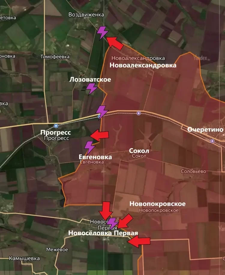 На Покровском направлении основные направления движения ВС РФ на этом участке - в сторону Воздвиженки (для последующего перерезания дороги Покровск - Константиновка) и в сторону Прогресса. Продолжается и штурм Новосёловки Первой. Информация, которая поступает с этого участка, разнится. Многие источники утверждают, что большая часть населённого пункта перешла под контроль ВС РФ. Другие же источники менее оптимистичны и заявляют о боях на северной и восточной окраинах села.