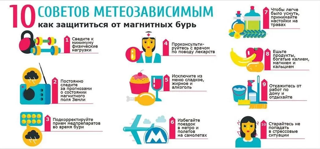 Обычно люди, на состояние которых влияют магнитные бури, знают, как вести себя в этот период, но мы на всякий случай напомним основное. Следите за прогнозом магнитных бурь. Они часто появляются, в том числе и на нашем сайте. Если вы принимаете лекарства, заранее проконсультируйтесь с врачом, как корректировать их дозировку в неспокойный период. В дни бурь обеспечьте себе спокойную обстановку, избегайте конфликтных ситуаций, стрессов и переутомления.