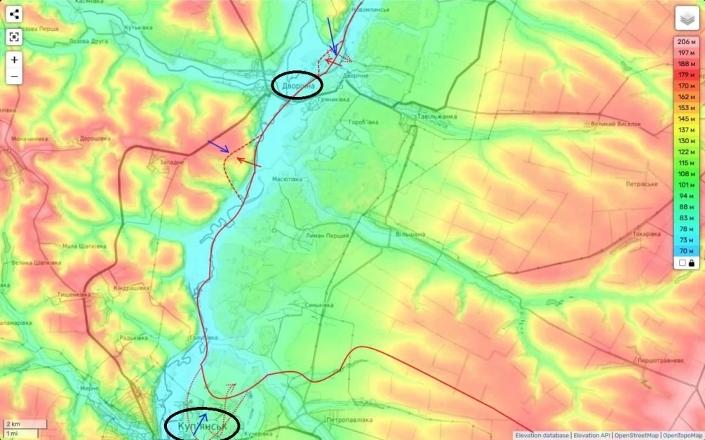 Он утверждает, что противник выбил российские силы с одного плацдарма на западном берегу реки Оскол и прижал их ко второму плацдарму, но при этом начались крупные механизированные штурмы в северо-восточной части промзоны Купянского района «Заосколье».
