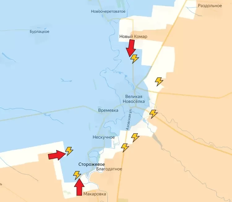 На Великоновосёлковском направлении продолжается формирование мешка для гарнизона ВСУ в Великой Новосёлке. Подразделения ВС РФ ведут бои южнее Нового Комара, недавно перешедшего под полный контроль Армии России.