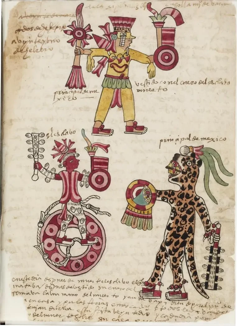 Воин-ягуар с трехчастно раскрашенным щитом. «Кодекс Мальябекки - один из ацтекских кодексов, созданный в Мексике в XVI веке, в начальный период конкисты. Назван в честь Антонио Мальябеки (Мальябекки), итальянского собирателя рукописей XVII века. Сейчас находится в Национальной центральной библиотеке во Флоренции