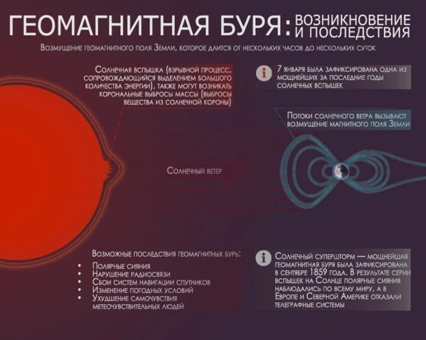 Причины возникновения геомагнитных бурь и их последствия: инфографика