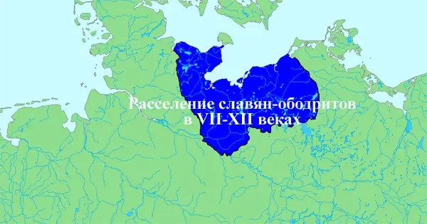 Синим цветом выделена территория расселения славян-ободритов. Археология и топонимика свидетельствуют о том, что ободриты зародились на западных поморских территориях, над рекой Одра. Вероятно, отсюда и произошло их название «Ob Odr», что означает «рядом с Одрой». Ободриты — это термин, используемый для группы из четырех племен. Первые — это ободриты (еще известные как ререги). Некоторые из их крепостей были Мехлин (Мекленбург), Сважин (Шверин), Дубин (Добин), Вышомеж (Висмар) и Илов (Иллов). Вторым ободритским племенем были варны, главной крепостью которых, вероятно, был Радомин (Гросс-Раден). К третьей группе относились полабцы, с крепостью Рацибуж (Ратценбург). Четвертым и последним из ободритов были вагры — второе по силе племя после ободритов. Они контролировали знаменитое пиратское логово — остров Вембрза (также Вембрза, Имбра, позже Фемарн). Их столицей был Старгард (Ольденбург). Еще одним крупным оплотом была будущая столица всех ободритов — Любек.