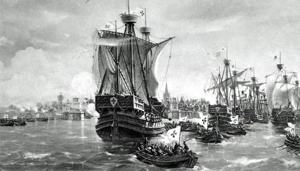 Корабли тевтонских рыцарей осаждают портовый город Висбю в конце XIV века, который защищают «Виталийские братья». Картина XIX века.