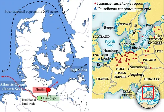 До прибытия голландцев почти вся торговля с Балтикой проходила через Любек. Точно так же Гамбург извлекал выгоду из того, что был единственным крупным атлантическим портом Ганзейского союза. Связь между Любеком и Гамбургом была важнейшим маршрутом для торговли на севере.