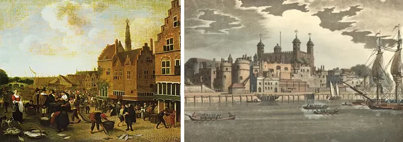 Амстердам, а позднее Лондон, были обязаны своим впечатляющим экономическим подъемом религиозным беженцам XVI века. Сефардские евреи и фламандские протестанты, бежавшие после падения Антверпена в 1585 году в Амстердам и Лондон, привезли с собой капитал и наладили международные торговые отношения, которые достигли Нового Света. Город Гамбург также был обязан своим экономическим развитием этим беженцам. На фото слева: Рыбный рынок в Лейдене. Источник: Frankfurt am Main, Städel Museum. На фото справа: Лондон XVI века.