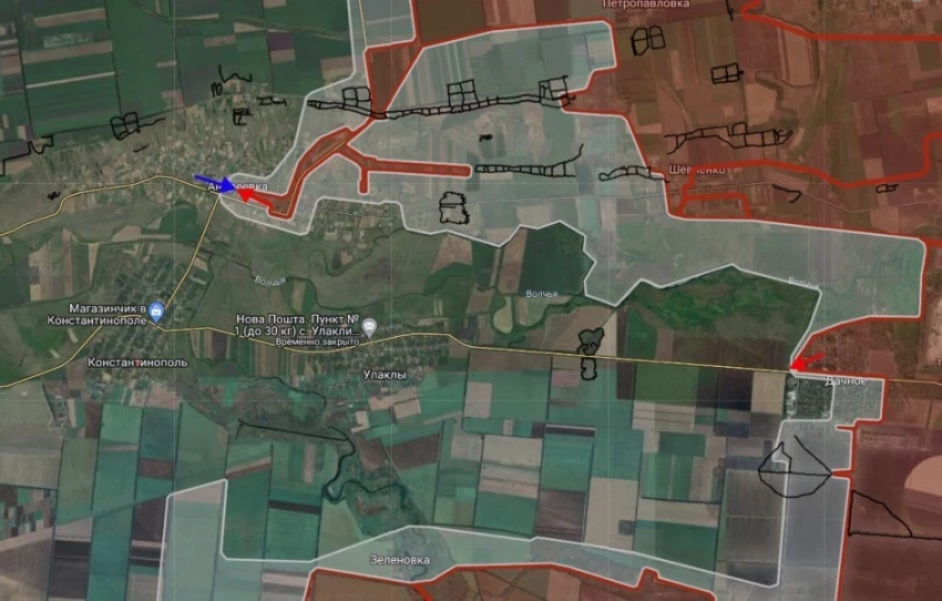 Константинопольское направление. Продолжаются встречные бои в центральной части Андреевки, ВС РФ давят в направлении Константинополя с севера и юга;