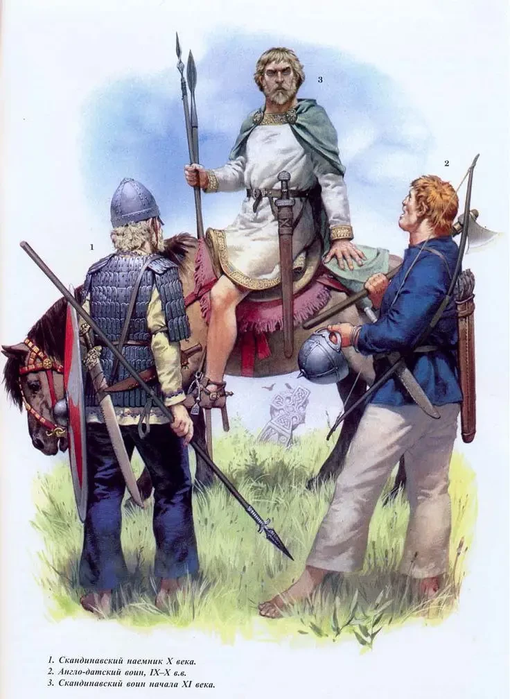 И с одной, и с другой стороны в составе сражающихся армий были лучники, но на тот момент ни англичане, ни их ближайшие родственники скандинавы это оружие не любили. Зато любили копья! Именно копьё указано как оружие большей части сражающихся, меч — оружие последнего шанса, за него берутся, когда копьё потеряно. При этом часто встречаются упоминания о метательных копьях — любовь англосаксов к дротикам известна.