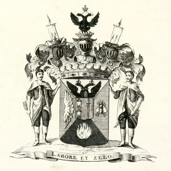 «Герб рода графа Безбородка». Щит держат два скифа, девиз – «Труд и ревность» (ревностность)