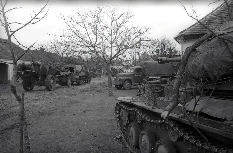 Колонна немецкой бронетехники, уничтоженная из засады советской артиллерией на границе Венгрии и Австрии, в районе города Детриц