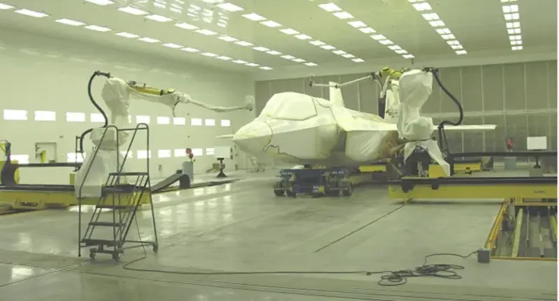 Роботизированные системы наносят антикоррозийное покрытие на истребитель-бомбардировщик F-35A ВВС США