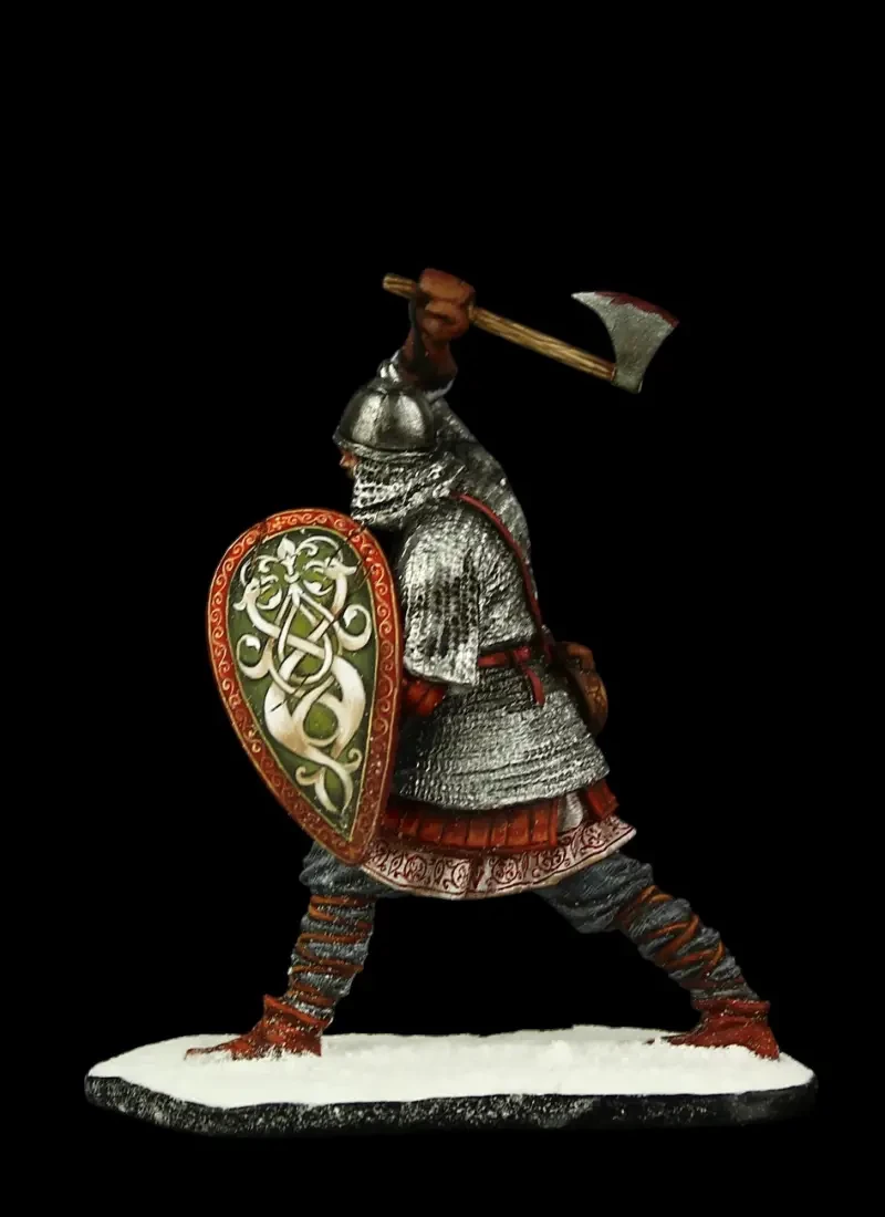 Знатный дружинник из войска Александра Невского. Как видите, доспехи в это время начинают утолщаться: поверх кольчуги всё большее количество воинов стали носить кирасу из металлических пластинок. Шлемы всё чаще оснащаются забралами в форме лицевой маски. Производители: «Silver Dream Studio» и студия «Оловянный Парад»