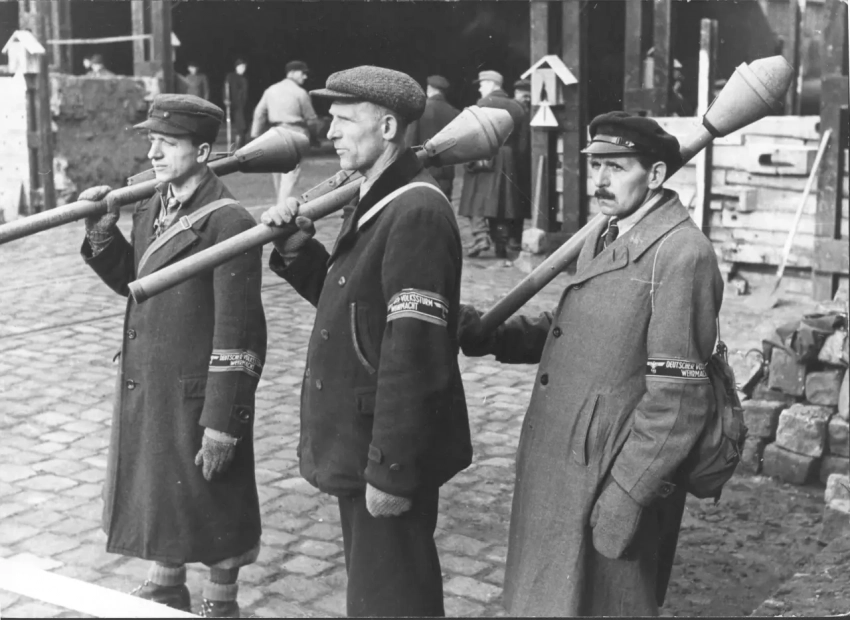 На вопрос гауляйтера округа Халле-Мерзебург Лео Эггелинга, откуда он должен брать оружие для фольксштурма, Мартин Борман ответил, что для их вооружения предназначены лишь ручные гранаты и фаустпатроны. Поэтому и обучать новобранцев обращению с винтовками не обязательно.