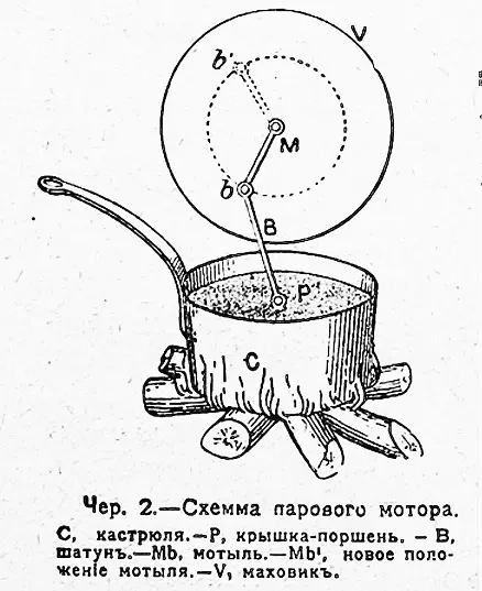 После этого открытия механикам оставалось лишь придумать, как преобразовать поступательное движение поршня во вращательное движение колеса. Это удалось сделать посредством стержня (шатуна), присоединенного к поршню, и тяжелого металлического круга — маховика, который, раскрутившись от толчка шатуна и набрав инерцию после совершения поршнем рабочего хода, возвращал его в исходное положение — заталкивал крышку внутрь кастрюли, чему способствовало резкое понижение давления в кастрюле вследствие выхода пара наружу. А маховик соединялся с шатуном коротким штоком, названным мотылем. Подвижность деталям обеспечивали три шарнира. Вот и вся премудрость.