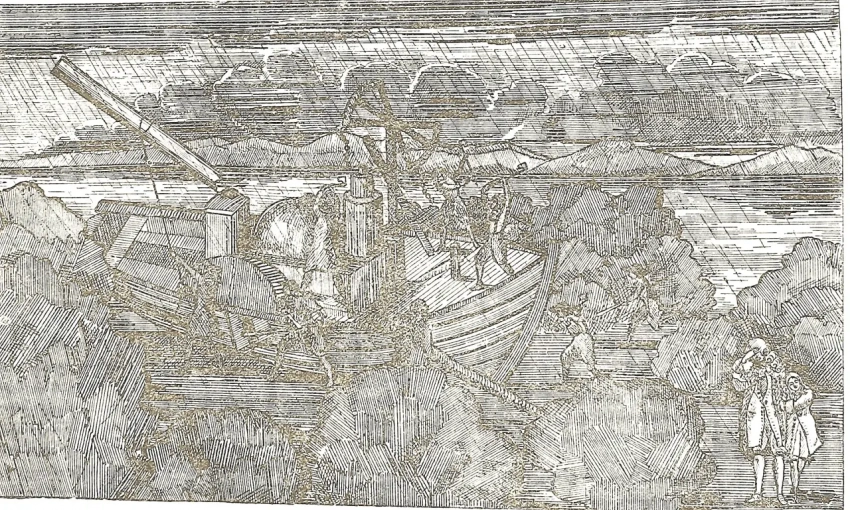 Гравюра неизвестного художника, иллюстрирующая уничтожение парохода Папина (отчаявшийся изобретатель запечатлен в нижнем правом углу)
