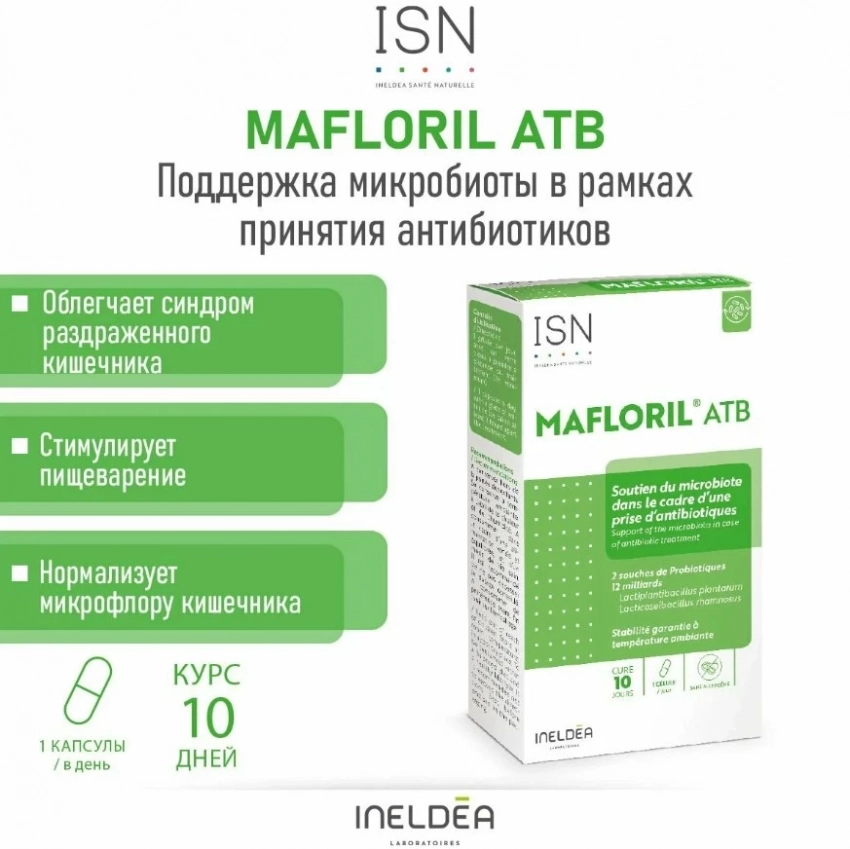 MAFLORIL ATB от Ineldea Sante Naturelle — это универсальный союзник для тех, кто хочет навести порядок в ЖКТ и чувствовать себя бодрым без побочек и заморочек. В рейтинге топ БАДов для мужчин этот французский комплекс пробиотиков и пребиотиков уверенно держится в лидерах: он восстанавливает микрофлору, помогает переваривать даже тяжёлые продукты, регулирует вес и делает кожу чище. Упаковка на 10 капсул — идеальна для экспресс-курса после антибиотиков или просто при сбое. Работает мягко, без агрессии и привыкания.