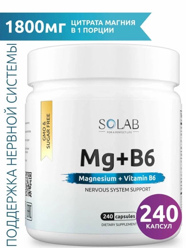 Магний + B6 от SOLAB — это эффективный комплекс, созданный для борьбы с эмоциональным перенапряжением и стрессом. Благодаря высокобиоусвояемому цитрату магния и витамину B6, он помогает нормализовать работу нервной системы, улучшает концентрацию и мозговую активность, а также способствует качественному сну и снижению тревожности. Продукт идеально подходит для людей, испытывающих физическое и умственное переутомление, повышая общую работоспособность и снижая симптомы стресса.