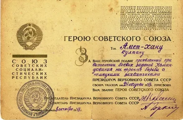 Звание Героя Советского Союза Амет-хану было присвоено 24 августа 1943 года.